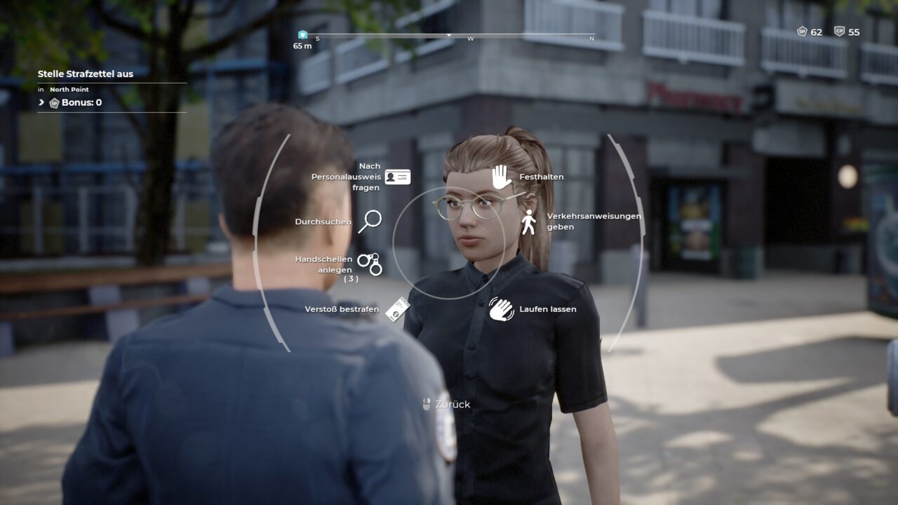 Das Münchner Entwicklungsstudio Aesir Interactive feierte mit Police Simulator: Patrol Officers (2022) einen kommerziellen Erfolg. Im Videospiel gehen wir als Polizeibeamt:in in einer fiktiven US-amerikanischen Stadt auf Streife. Das Studio reiht den Titel in seine „gewaltfreien“ Arbeitssimulatoren ein – dabei lassen sich auf mehreren Ebenen gewaltvolle Interaktionen und Machtgefüge im Spiel entdecken, während strukturelle Gewalt, Rassismus und Verschwiegenheitskultur ausgeblendet werden.