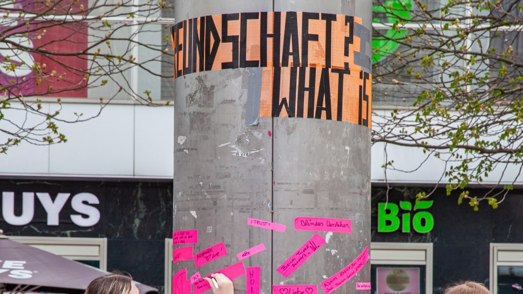 The exploration and dismantling of the myth of Soviet friendship was based on group readings, fieldwork, artistic and academic research, and the participatory practice of constructing a counter-monument to Friendship at the Open-Air Museum of Decoloniality on Alexanderplatz in March 2026, as the rhetoric of the Friendship of Peoples can be found manifested in different places in Berlin as well. Alexander’s Square features a Brunnen der Völkerfreundschaft (Friendship of Peoples Fountain), and, hidden among the Plattenbauten of Marzahn, there is a mosaic column dedicated to the Deutsch-Sowjetische Freundschaft (German-Soviet Friendship).